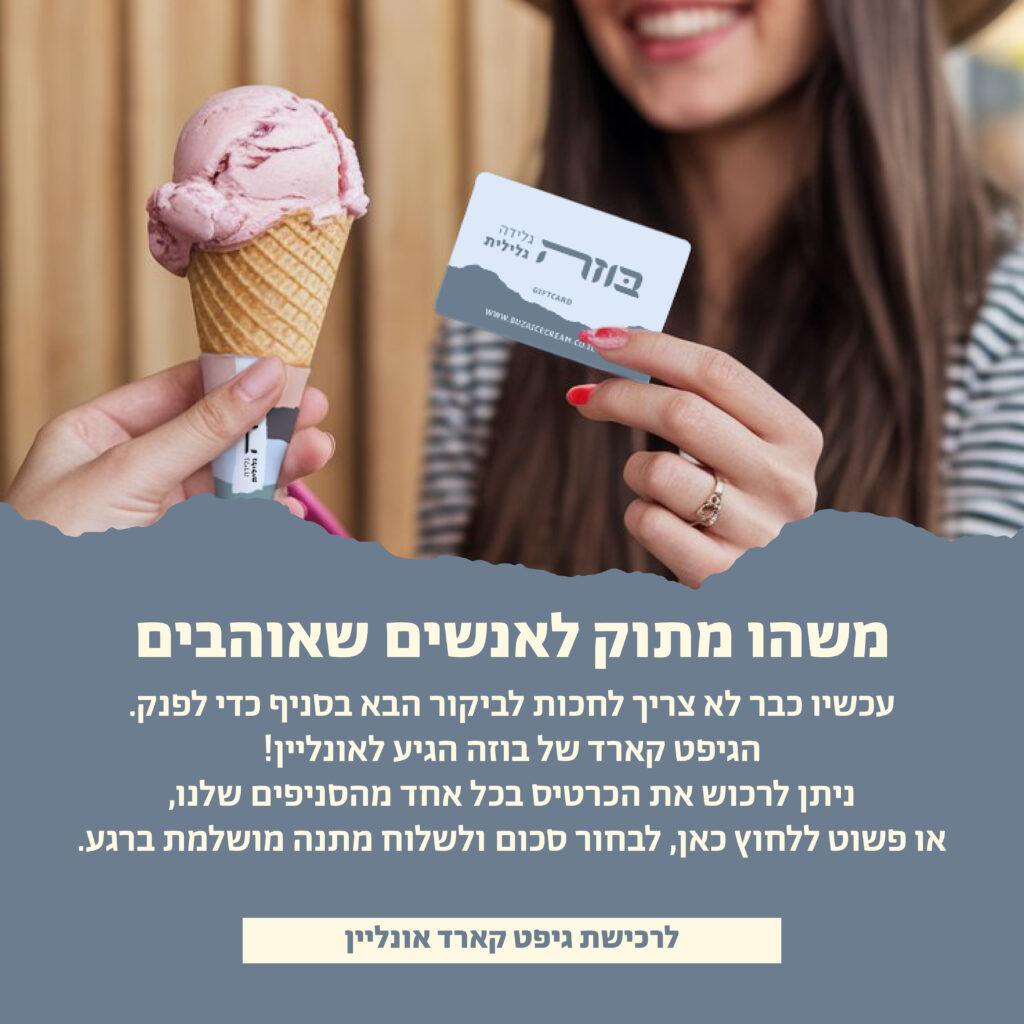 כשהקמנו את בוזה חלמנו על גלידה טריה, מקומית, עונתית וטעימה באמת, כזו שתחגוג את הגליל האהוב שלנו, הפסיפס האנושי המיוחד והמגוון , האדמה, הטעמים והריחות הייחודיים רק לו ובעיקר תעשה טוב על הלב.